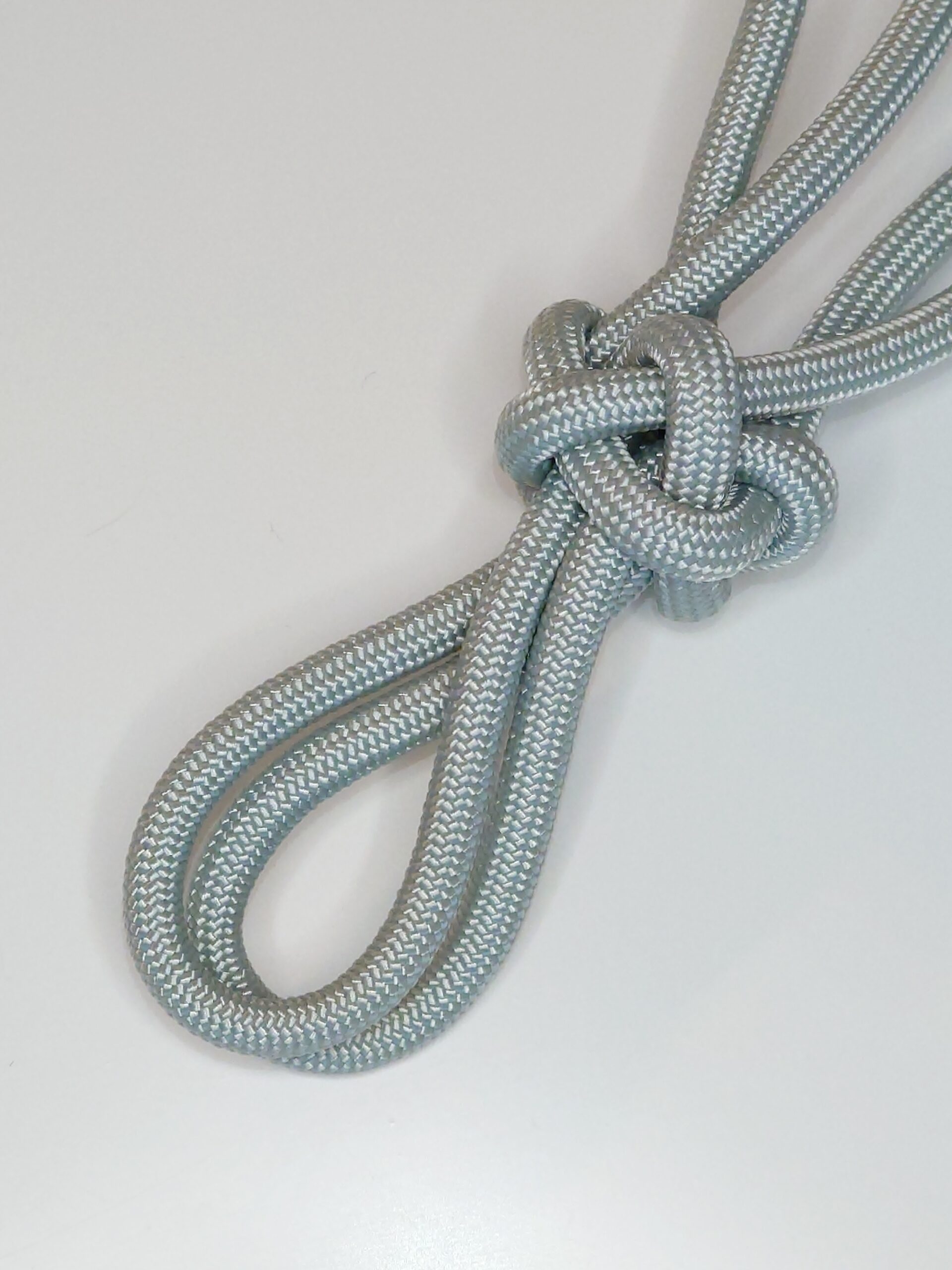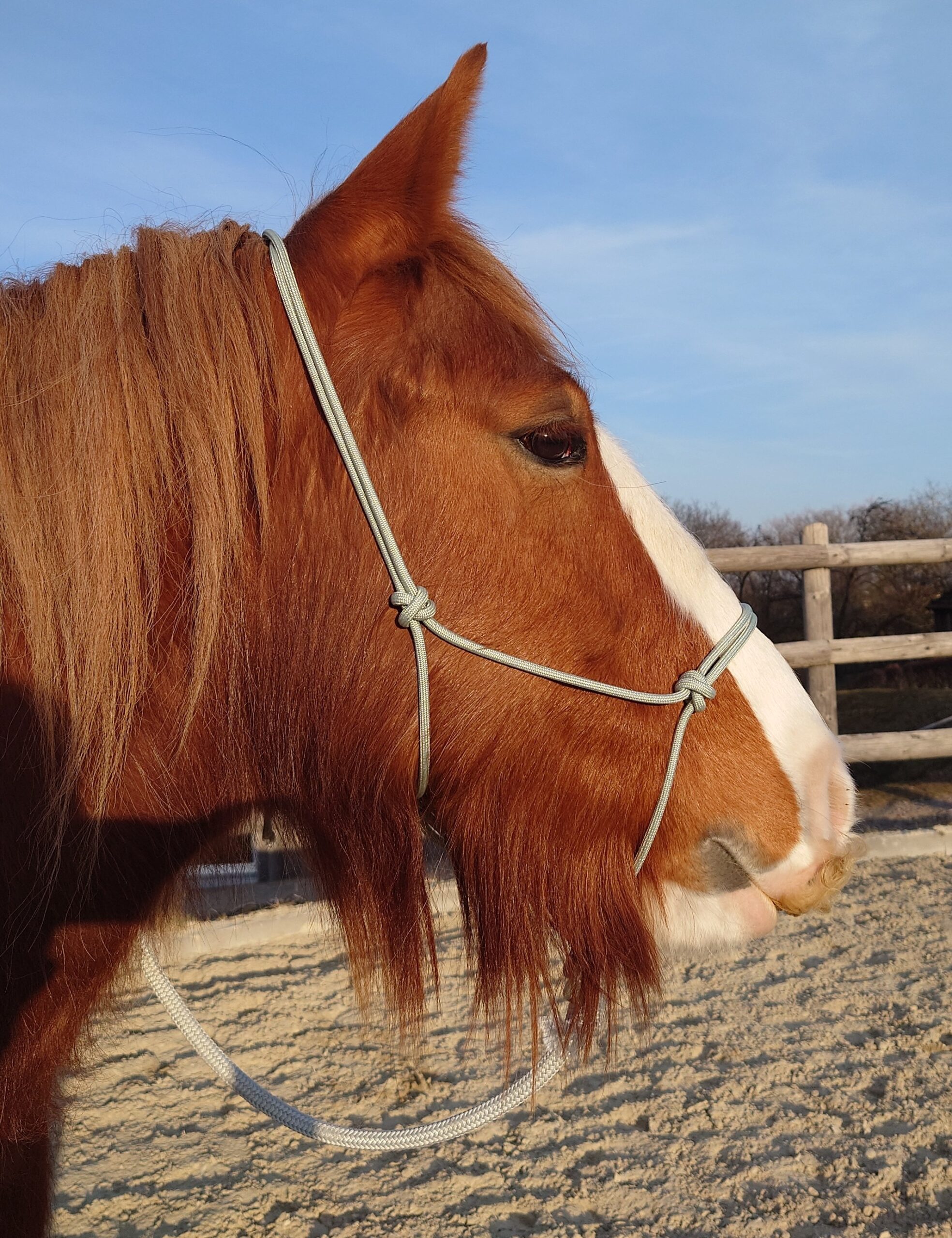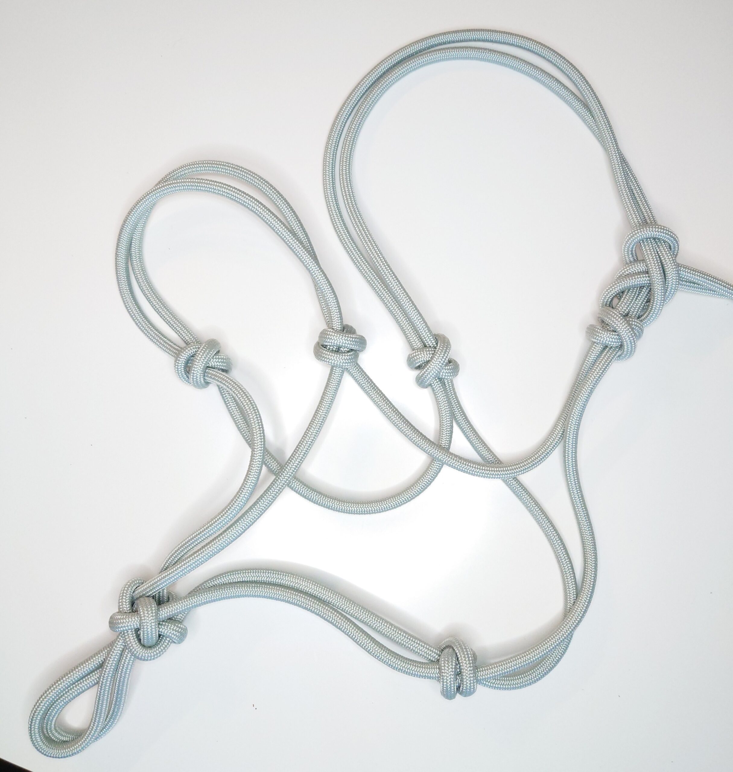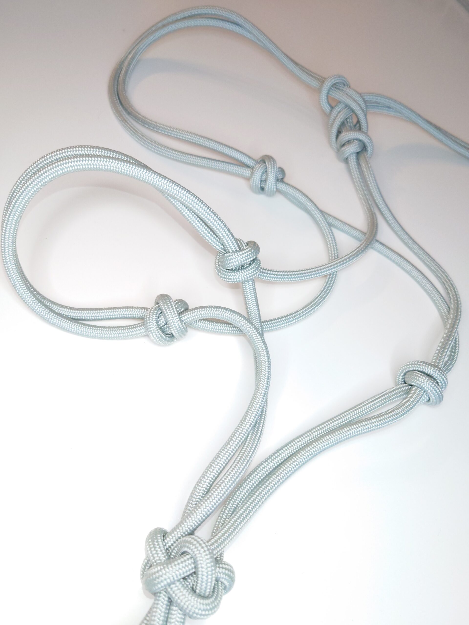 Knotenhalfter nach Maß aus Paramax 1250 Type V mit 6 mm Durchmesser. Mit Diamantknoten am Kinn, alle anderen Knoten sind gekreuzte Knoten für die bessere Stabilität und angenehmen Tragekomfort fürs Pferd. Im Vergleich zum „Knotenhalfter BASIC“ ist das „Knotenhalfter PREMIUM“ etwas schwerer und formstabiler, aber trotzdem nicht hart oder starr sondern schön flexibel und schmiegt sich dem Kopf angenehm an.